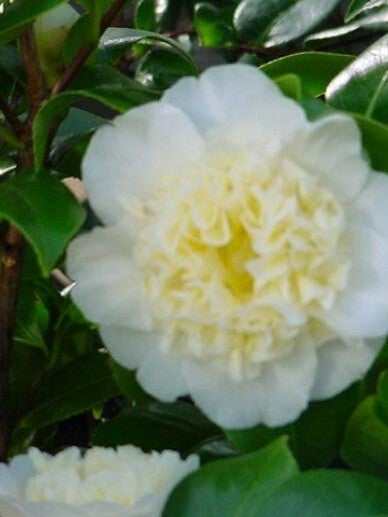 Camellia japonica 'Brushfield's Yellow' is wit/cremekleurig.